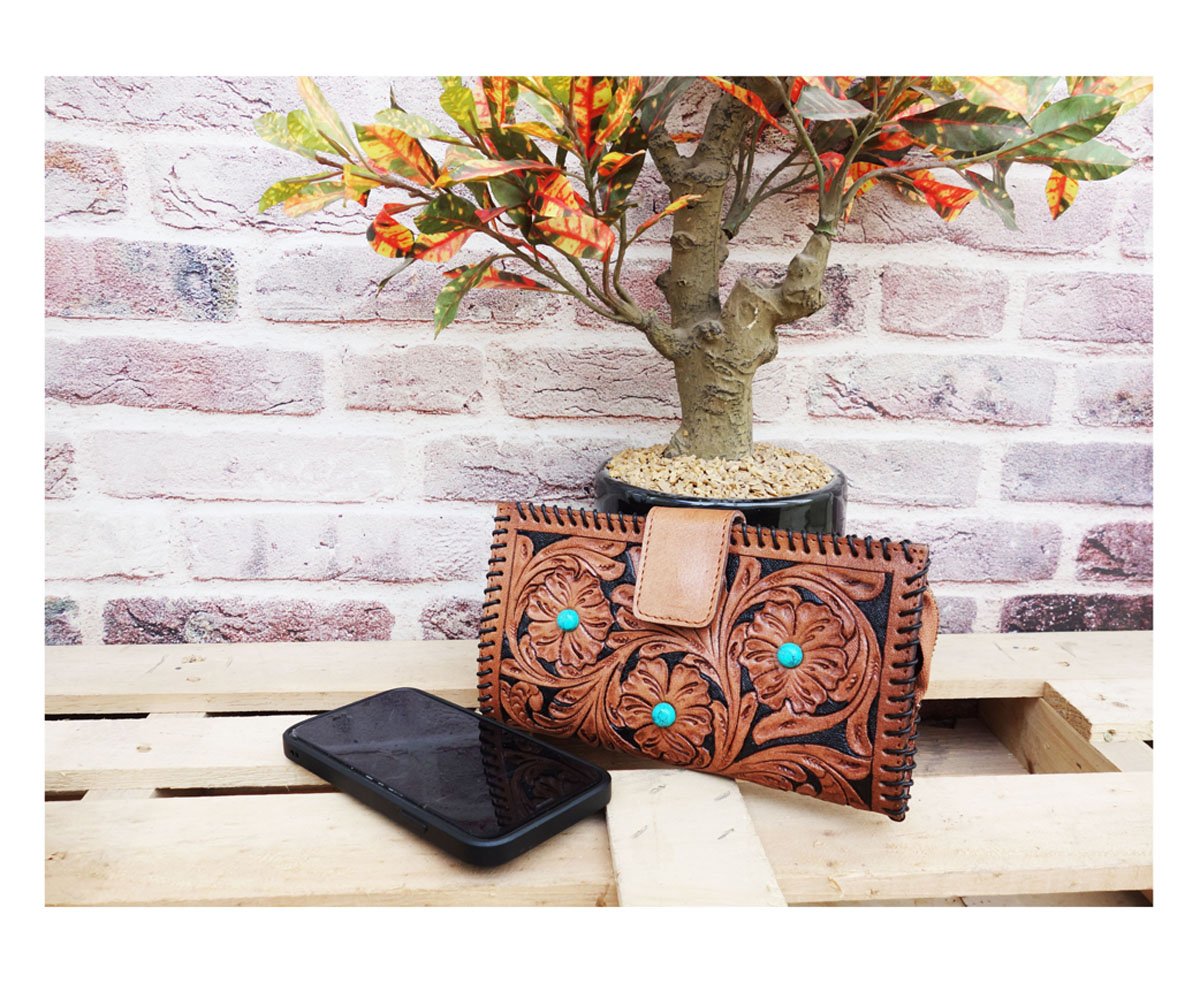 Handmade Leather Clutch, Hand Tooling Leather Wallet, Braided Edges.